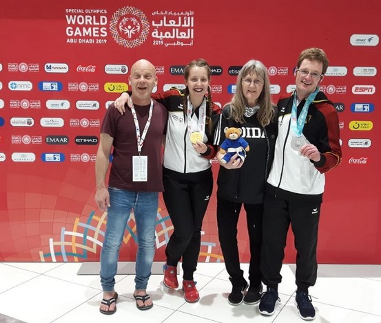 Gold und Silber präsentieren die Athleten und dazwischen die stolzen Trainer Gabi und Frank.