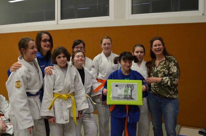Sabine Friemond-Kund von der Buchhandlung "Lesezeit" in Voerde überreichte am 12.02. unseren Judo-Damen einen Scheck.