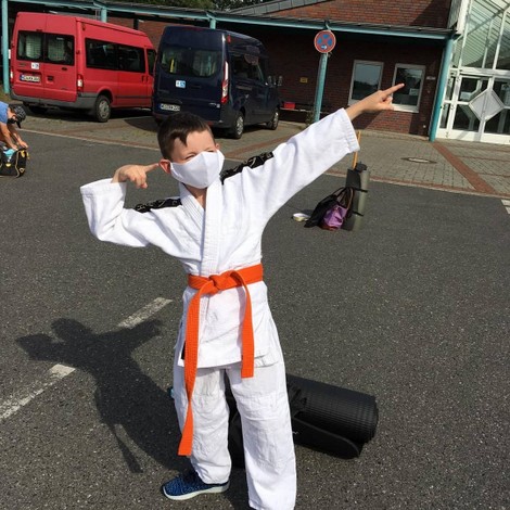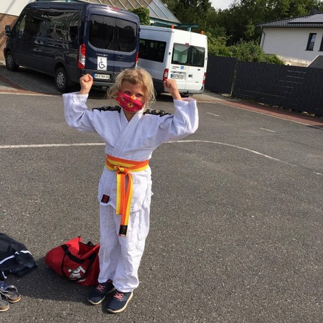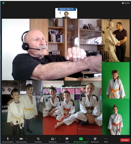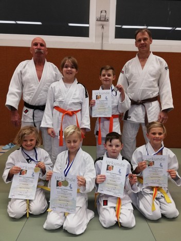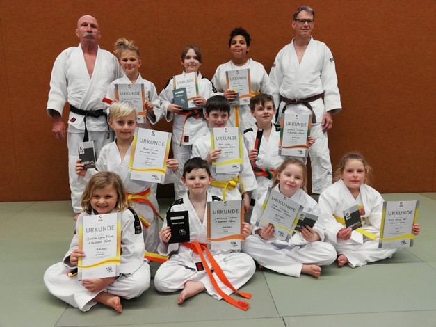 Nicole van Peeren, Leif van Peeren, Veit van Peeren, Luke Müller, Brian Müller, Marlin Jäger und Mario Jäger. Während die Kinder letztes Jahr noch die Möglichkeit hatten mit Maske und Abstand ihre ersten Judoerfahrungen in der Halle zu machen, waren die Eltern und Veit, als Geschwisterkind, erst nur Zuschauer. Als in der Halle kein Training mehr möglich war, wurden kurzerhand Matten für zu Hause besorgt und die Trainer Walter Trapp und Ralf Bittscheidt führten das Training online fort. Dazu wurden die Eltern und Geschwister als Hilfen benötigt. Sie erwiesen sich dabei schnell als sehr gute Partner und fanden selbst Spaß am Judo, so dass sie aktive Mitglieder wurden und sich den neuen Gürtel fleißig erarbeiteten. Die fortgeschrittenen jüngeren Judokas trainieren ebenfalls regelmäßig fleißig online zu Hause und bleiben somit am Ball. Aufgrund der immer komplexer werdenden Anforderungen ist für sie allerdings bei der bereits erreichten Leistungsklasse keine online-Prüfung mehr möglich. Hier wird intensiv daran gearbeitet, dass das bereits vorhandene gute Wissen behalten und vertieft wird. Alle freuen sich auf den Zeitpunkt, wenn wieder alle zusammen auf der Matte stehen werden und das Gelernte in der Praxis mit neuen Partnern probiert werden kann.