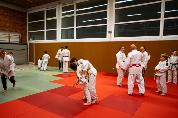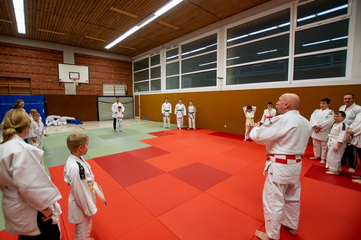 Gemäß den Judo-Ritualen wurden die SPD-Ratsmitglieder Jan Scholte-Reh, Thorben Braune und Benedikt Lechtenberg von den rund fünfzehn Sportlerinnen und Sportlern zum Trainingsbeginn begrüßt. Kinder und Trainer knieten sich dafür hin und legten die Handflächen auf die Oberschenkel. Die Augen wurden für einen Moment geschlossen, um sich zu konzentrieren. Der sozialdemokratische Besuch antwortete mit einer Verbeugung. Danach startete die von Trainerin Gabi Gramsch geleitete Gruppe mit verschiedenen Übungen. „Mir geht immer wieder das Herz auf, wenn ich die motivierten Kinder und Jugendlichen beim Training sehe“, sagte der 1. Vorsitzende Hans Künne im Gespräch mit den SPD-Vertretern.