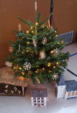 Zu einer Weihnachtsdisco gehört ein Weihnachtsbaum.