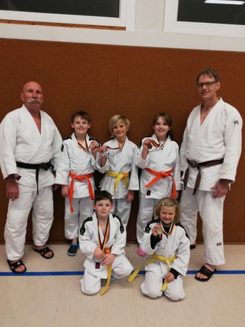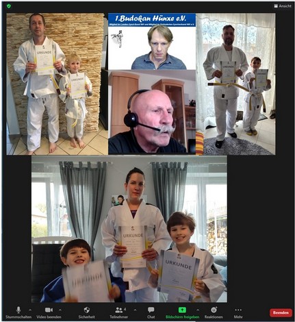 Nicole van Peeren, Leif van Peeren, Veit van Peeren, Luke Müller, Brian Müller, Marlin Jäger und Mario Jäger. Während die Kinder letztes Jahr noch die Möglichkeit hatten mit Maske und Abstand ihre ersten Judoerfahrungen in der Halle zu machen, waren die Eltern und Veit, als Geschwisterkind, erst nur Zuschauer. Als in der Halle kein Training mehr möglich war, wurden kurzerhand Matten für zu Hause besorgt und die Trainer Walter Trapp und Ralf Bittscheidt führten das Training online fort. Dazu wurden die Eltern und Geschwister als Hilfen benötigt. Sie erwiesen sich dabei schnell als sehr gute Partner und fanden selbst Spaß am Judo, so dass sie aktive Mitglieder wurden und sich den neuen Gürtel fleißig erarbeiteten. Die fortgeschrittenen jüngeren Judokas trainieren ebenfalls regelmäßig fleißig online zu Hause und bleiben somit am Ball. Aufgrund der immer komplexer werdenden Anforderungen ist für sie allerdings bei der bereits erreichten Leistungsklasse keine online-Prüfung mehr möglich. Hier wird intensiv daran gearbeitet, dass das bereits vorhandene gute Wissen behalten und vertieft wird. Alle freuen sich auf den Zeitpunkt, wenn wieder alle zusammen auf der Matte stehen werden und das Gelernte in der Praxis mit neuen Partnern probiert werden kann.