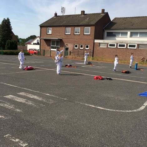 Die Judokinder des 1. Budokan Hünxe haben ihr Outdoor-Training wieder begonnen. Für die Wettkampfkids haben sich die Trainer einiges einfallen lassen damit die Abstände auch eingehalten werden. Cool ist die verlängerte Hand, womit eine kleine berührende Hilfestellung möglich ist.