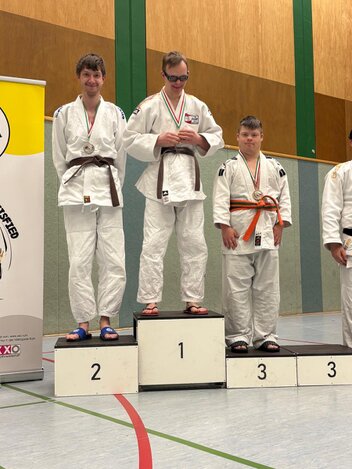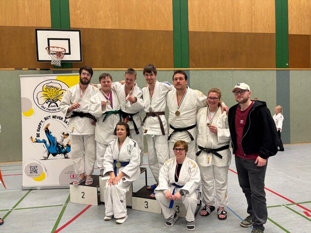 Drei Judoka vom 1. Budokan Hünxe starteten für NRW in der Haltegriffkata im ID-Judo. Drei Oberhausener waren als sogenannte Unified-Partner zusammen mit Judoka vom 1. Budokan Hünxe mit geistigen Beeinträchtigungen (intellectual disability = ID) am Start. Bei der Kata, bei denen genau vorgegebene Würfe oder Haltegriffe und deren Abwehr gezeigt werden müssen, traten die unterschiedlichen Wettkampfklassen in einer gemeinsamen Veranstaltung, aber nicht gegeneinander an.