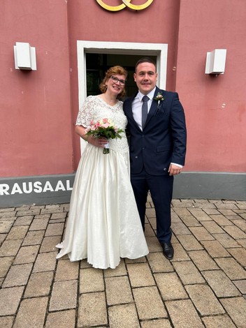 Andrea und Timo vor dem Standesamt in Oberhausen.
